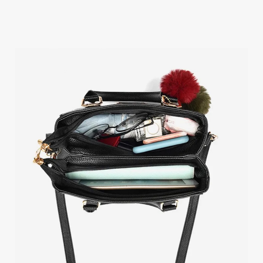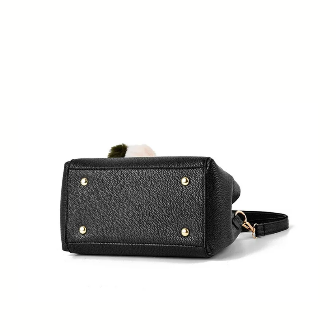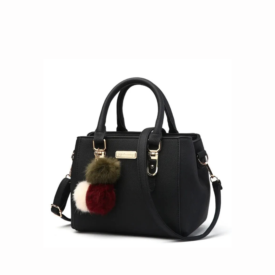 Defined lines and refined proportions bring a modern elegance to this compact handbag. Its textured finish and polished gold-tone hardware highlight the structured silhouette, while the soft decorative pom-poms add a playful yet elegant accent. A perfect choice for elevating everyday urban looks.