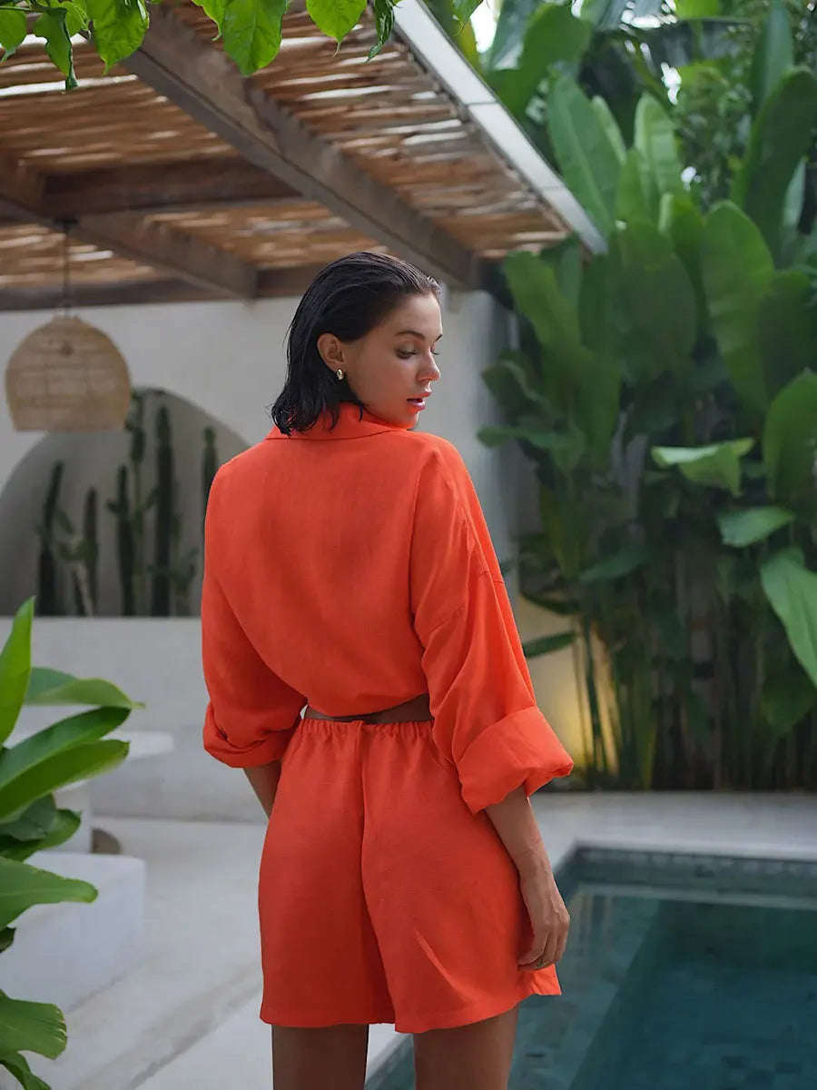 Discover the Cozy Cotton Shirt and Shorts Set, the perfect fusion of comfort and relaxed elegance. Crafted from pure cotton, this loose-fit shirt and elastic-waist shorts set is the definition of casual-chic style. The fluid silhouette and lightness of the fabric ensure complete freedom of movement for your sunny days.