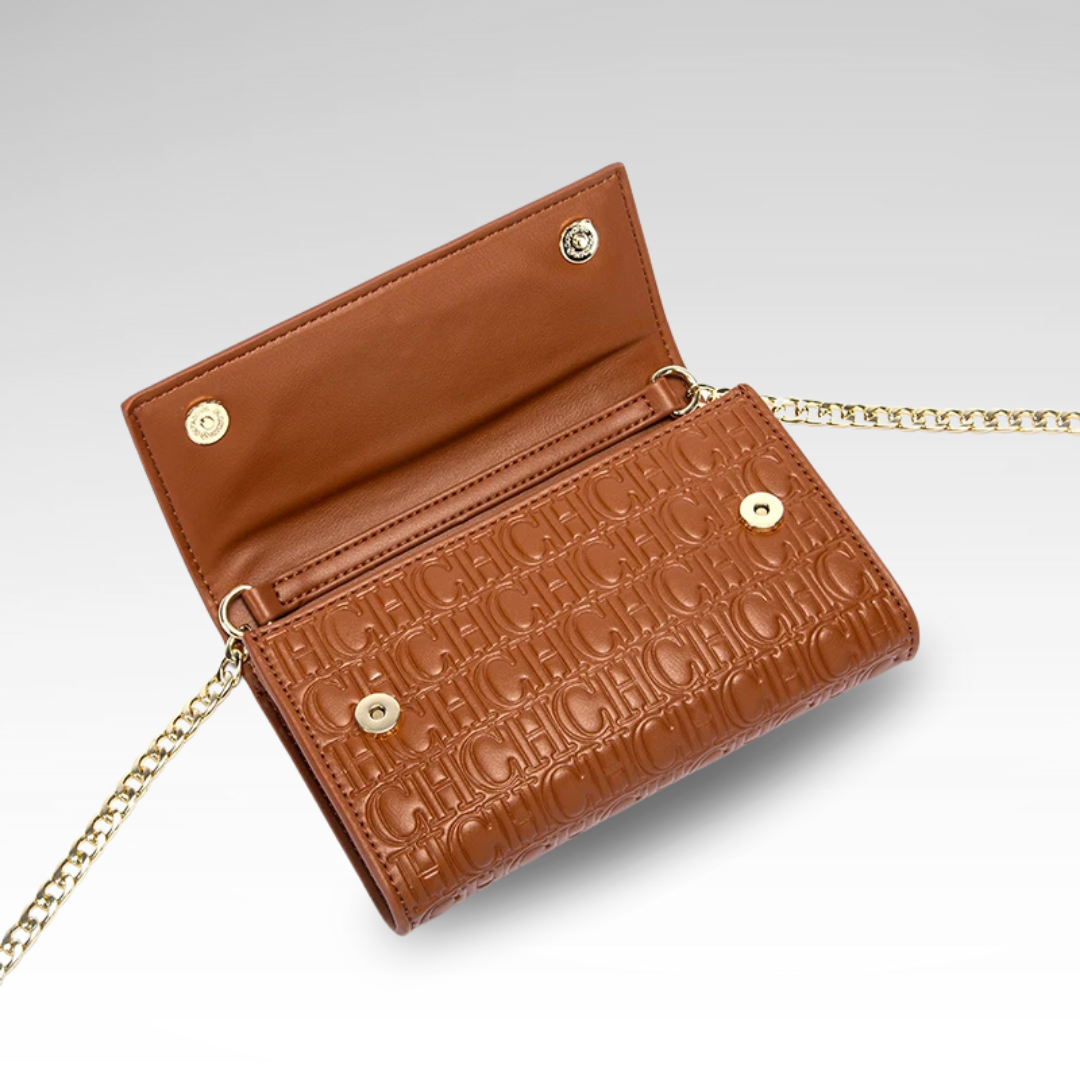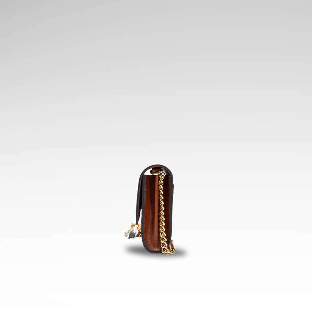 Compact elegance defines the Monogram Chain Wallet Bag. Crafted from refined material featuring the brand's iconic monogram, this versatile piece transitions seamlessly from day to night with sophistication. The gold chain strap adds a touch of timeless glamour.