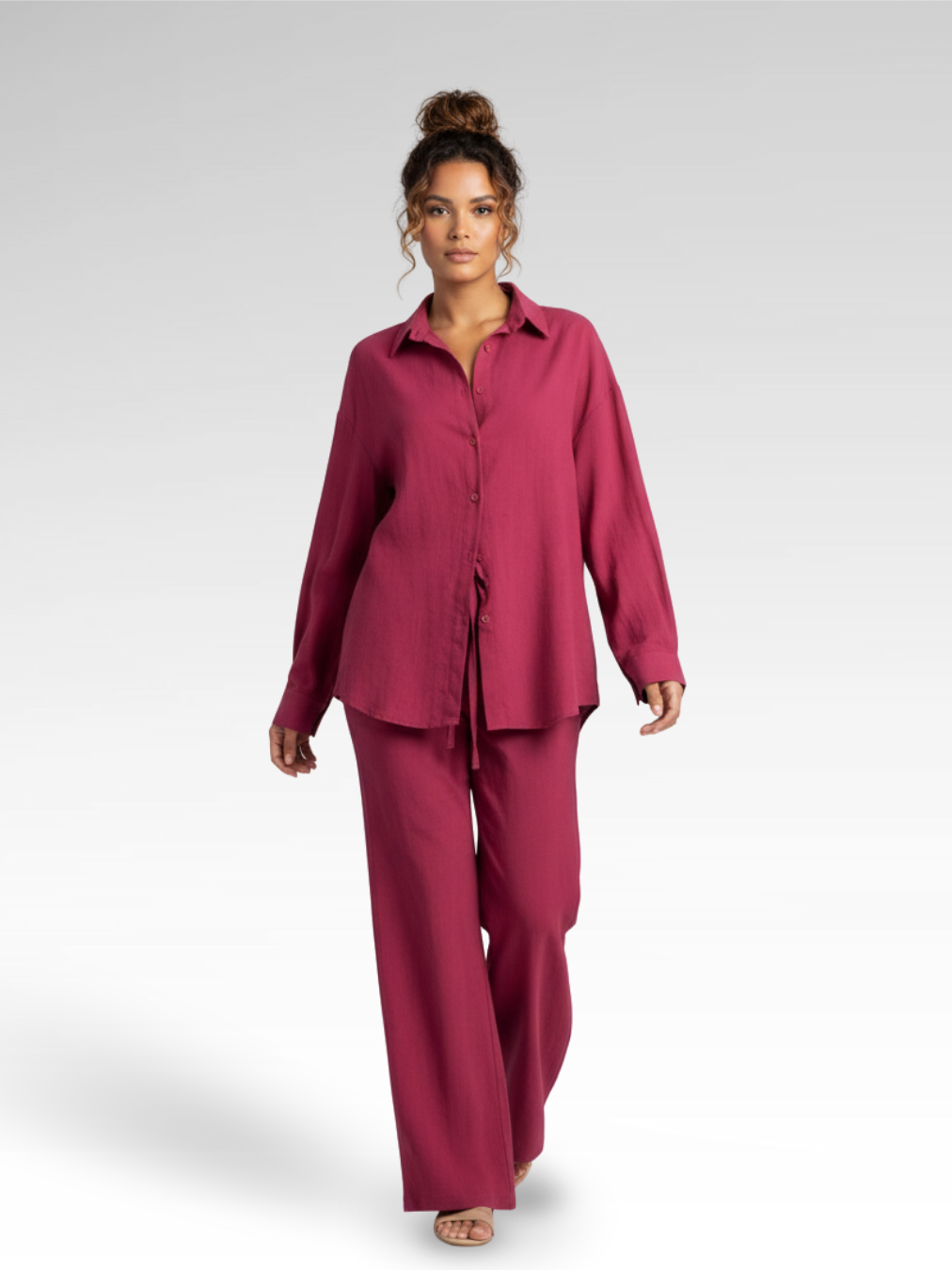 Discover the Solar Breeze Summer Set, a fusion of comfort and relaxed elegance for the warm season. Crafted from 100% noble cotton, this shirt and wide-leg pants set is the definition of casual-chic style. The fluid silhouette and lightweight fit are perfect for accompanying your sunny days with complete freedom and sophistication.